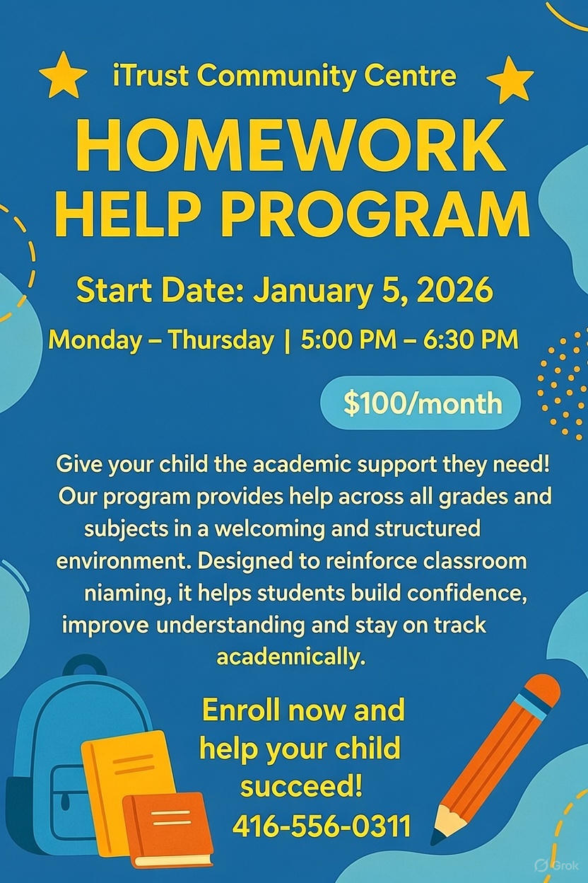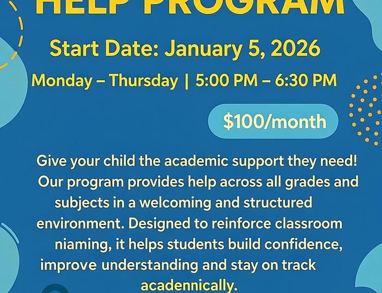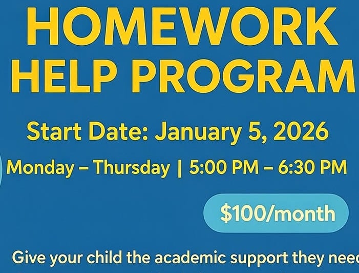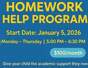 The Homework Help Program provides students with academic support across all grades and subjects in a welcoming and structured environment. Designed to reinforce classroom learning, the program helps students build confidence, improve understanding, and stay on track academically.