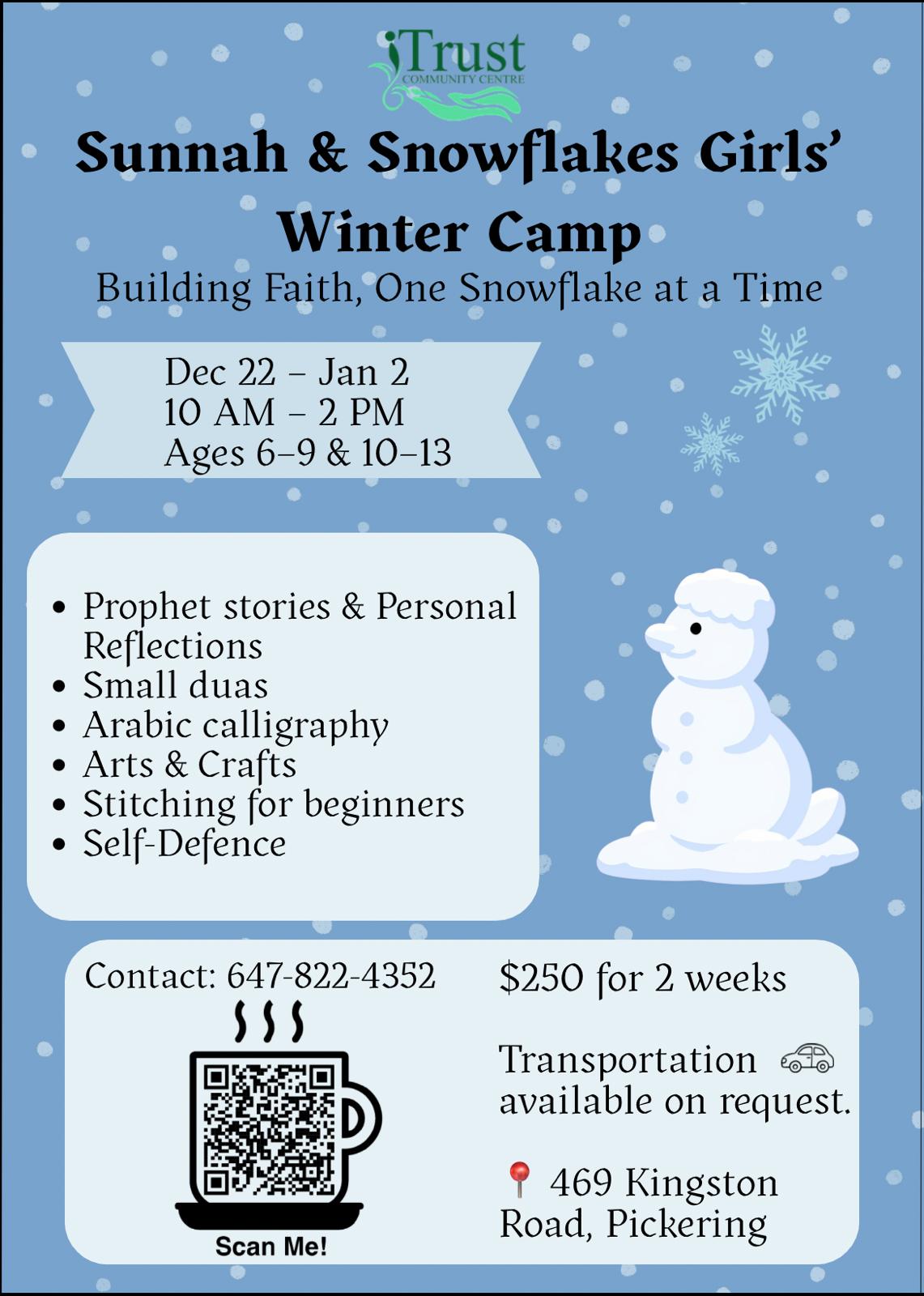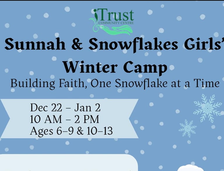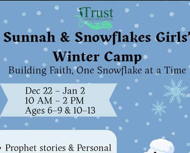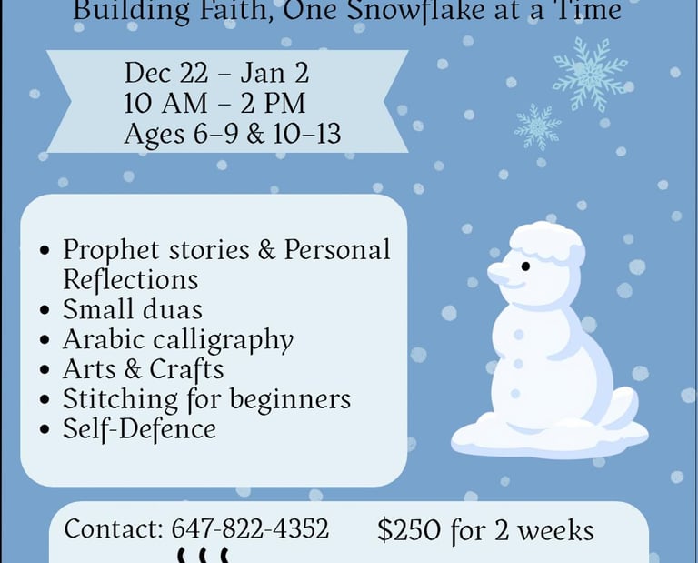 Sunnah and Snowflakes Winter Camp for Girls offers a faith-filled winter break! Girls will explore prophetic stories, reflect on personal lessons, learn du'as, and enjoy arts, crafts, and fun activities in a warm, engaging environment.