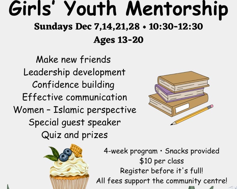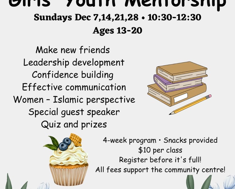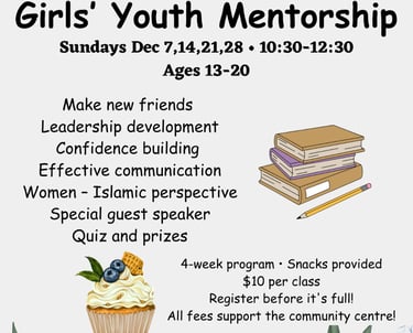 Join our Girls Youth Mentorship Program—a four-week journey designed for young girls to build confidence, develop leadership skills, and enhance communication. Participants will explore the Islamic perspective on women, make new friends, and enjoy fun activities, quizzes, and prizes along the way